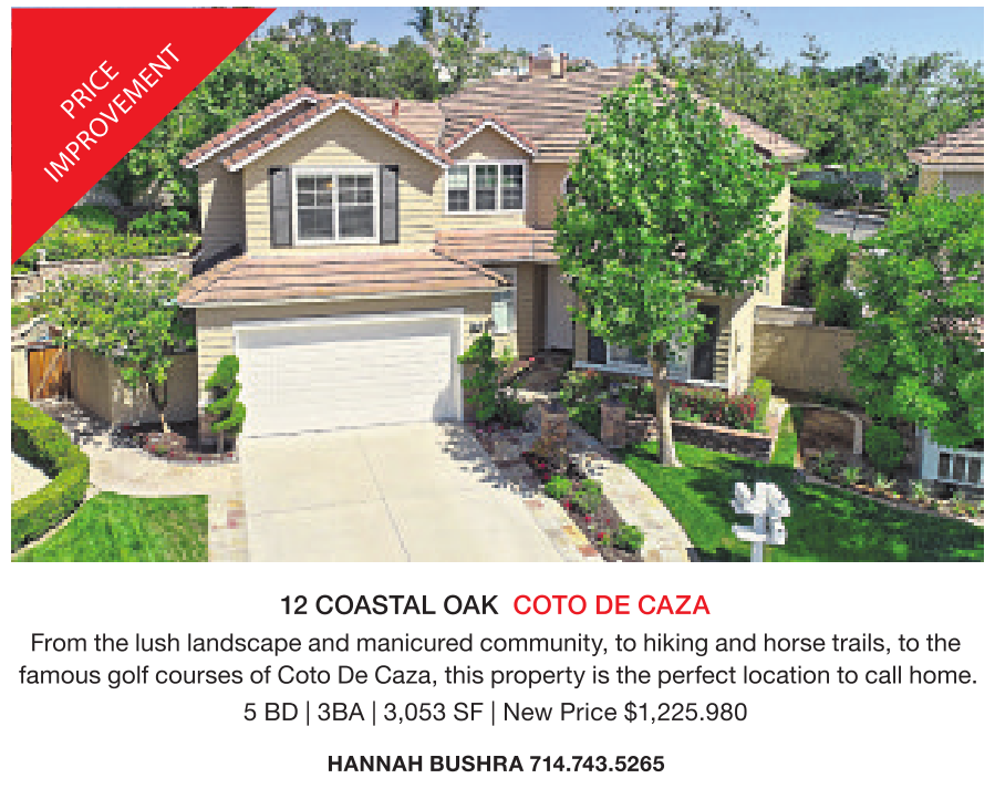 12 COASTAL OAK COTO DE CAZA From the lush landscape and manicured community, to hiking and horse trails, to the famous golf courses of Coto De Caza, this property is the perfect location to call home. 5 BD | 3BA | 3,053 SF | New Price $1,225.980 HANNAH BUSHRA 714.743.5265