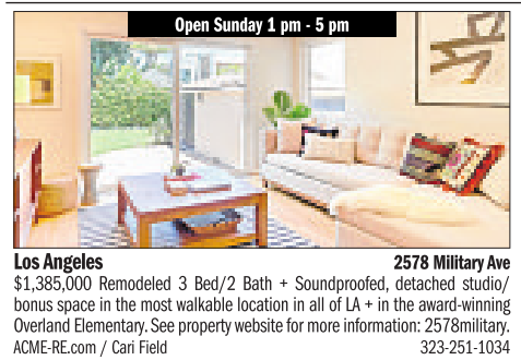 Los Angeles 2578 Military Ave $1,385,000 Remodeled 3 Bed/2 Bath + Soundproofed, detached studio/ bonus space in the most walkable location in all of LA +inthe award-winning Overland Elementary.See property website formore information: 2578military. ACME-RE.com/CariField 323-251-1034