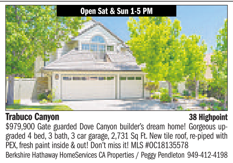 Trabuco Canyon 38 Highpoint $979,900 Gate guarded Dove Canyon builder’s dream home! Gorgeous upgraded 4bed, 3bath, 3car garage, 2,731 Sq Ft. Newtile roof, re-piped with PEX, fresh paint inside &out! Don’t miss it! MLS #OC18135578 BerkshireHathaway HomeServices CA Properties /Peggy Pendleton 949-412-4198