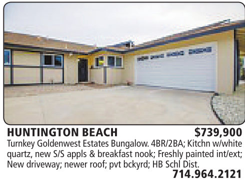 HUNTINGTON BEACH $739,900 Turnkey Goldenwest Estates Bungalow.4BR/2BA; Kitchn w/white quartz, new S/S appls &breakfast nook; Freshly painted int/ext; New driveway; newer roof; pvt bckyrd; HB Schl Dist.