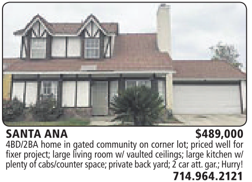 SANTA ANA $489,000 4BD/2BA home in gated community on corner lot; priced well for fixer project; large living room w/ vaulted ceilings; large kitchen w/ plenty of cabs/counter space; private back yard; 2car att. gar.; Hurry!