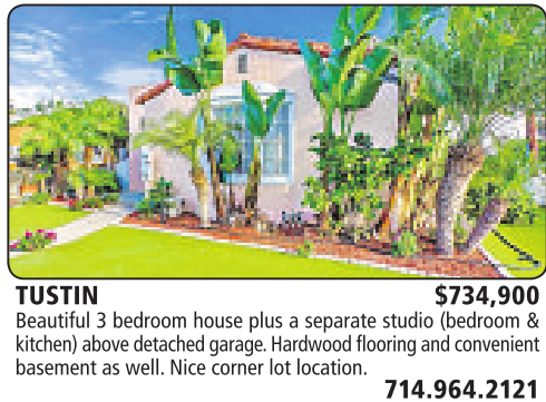 TUSTIN $734,900 Beautiful 3bedroom house plus aseparate studio (bedroom & kitchen) abovedetached garage. Hardwood flooring and convenient basement as well. Nice corner lot location.