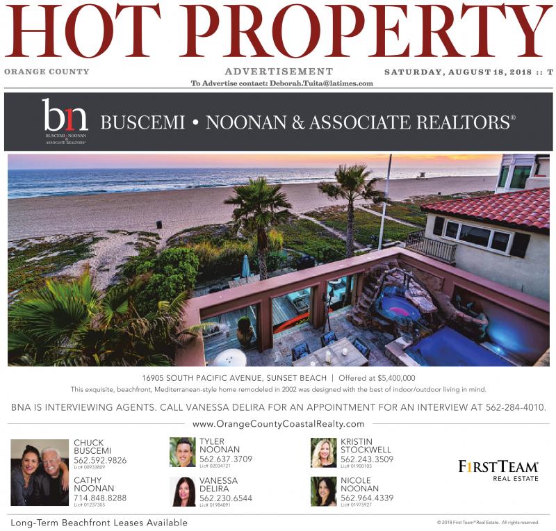 To Advertise contact: Deborah.Tuita@latimes.com SATURDAY, AUGUST 18, 2018 :: T BUSCEMI NOONAN & ASSOCIATE REALTORS ® BUSCEMI • NOONAN & ASSOCIATE REALTORS ® 16905 SOUTH PACIFIC AVENUE, SUNSET BEACH | Offered at $5,400,000 This exquisite, beachfront, Mediterranean-style home remodeled in 2002 was designed with the best of indoor/outdoor living in mind. BNA IS INTERVIEWING AGENTS. CALL VANESSA DELIRA FOR AN APPOINTMENT FOR AN INTERVIEW AT 562-284-4010. www.OrangeCountyCoastalRealty.com CHUCK BUSCEMI 562.592.9826 Lic# 00933809 CATHY NOONAN 714.848.8288 Lic# 01237305 TYLER NOONAN 562.637.3709 Lic# 02034721 VANESSA DELIRA 562.230.6544 Lic# 01984091 KRISTIN STOCKWELL 562.243.3509 Lic# 01900105 NICOLE NOONAN 562.964.4339 Lic# 01975927 Long-Term Beachfront Leases Available ©2018 First Team ® Real Estate. All rights reserved.