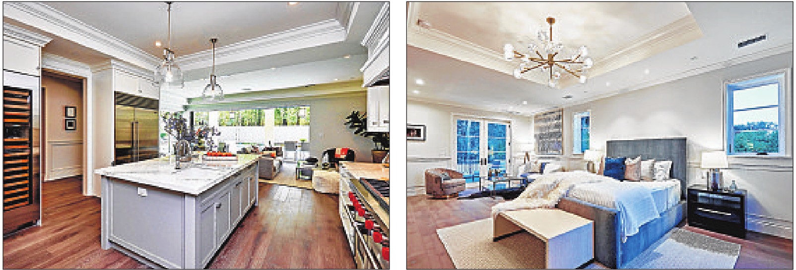 Features: Open-plan living space; hardwood floors; modern fixtures/ chandeliers; pocketing glass doors; artistic staircase; chef’s kitchen with center island; master suite with lounge; covered patio; swimming pool with waterfall feature and spa; lawn; landscaping