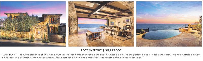 1 OCEANFRONT | $12,995,000 DANA POINT: The rustic elegance of this over 8,000 square foot home overlooking the Pacific Ocean illuminates the perfect blend of ocean and earth. This home offers a private movie theater, a gourmet kitchen, six bathrooms, four guest rooms including a master retreat enviable of the finest Italian villas.