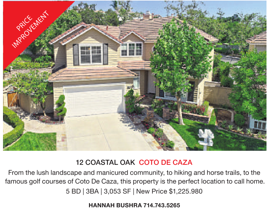 12 COASTAL OAK COTO DE CAZA From the lush landscape and manicured community, to hiking and horse trails, to the famous golf courses of Coto De Caza, this property is the perfect location to call home. 5 BD | 3BA | 3,053 SF | New Price $1,225.980 HANNAH BUSHRA 714.743.5265
