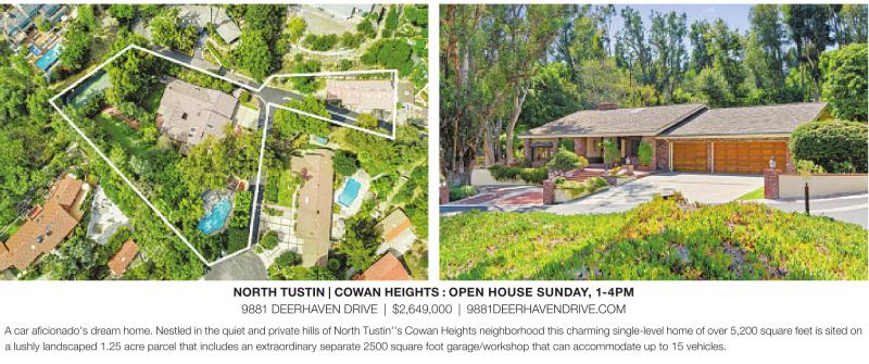 NORTH TUSTIN | COWAN HEIGHTS : OPEN HOUSE SUNDAY, 1-4PM 9881 DEERHAVEN DRIVE | $2,649,000 | 9881DEERHAVENDRIVE.COM A car aficionado's dream home. Nestled in the quiet and private hills of North Tustin''s Cowan Heights neighborhood this charming single-level home of over 5,200 square feet is sited on a lushly landscaped 1.25 acre parcel that includes an extraordinary separate 2500 square foot garage/workshop that can accommodate up to 15 vehicles.