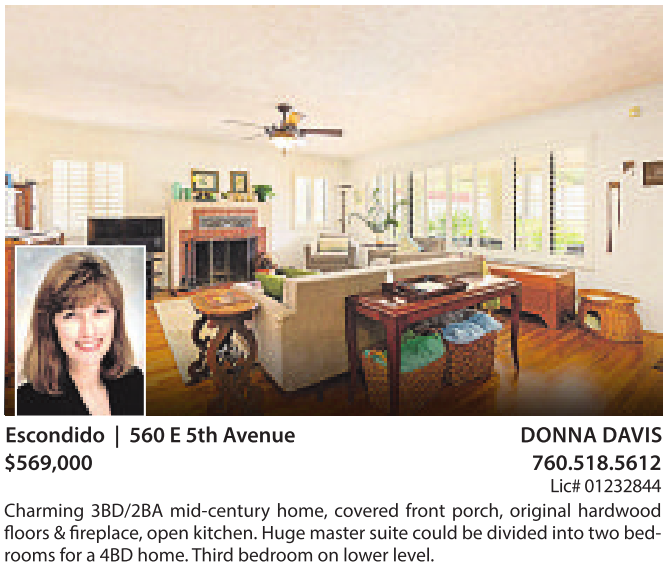 Escondido | 560 E5th Avenue DONNA DAVIS $569,000 760.518.5612 Lic# 01232844 Charming 3BD/2BA mid-century home, covered front porch, original hardwood floors & fireplace, open kitchen. Huge master suitecould be divided into twobedrooms fora4BD home.Third bedroom on lowerlevel.
