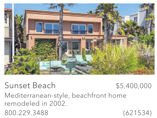 Sunset Beach $5,400,000 Mediterranean-style, beachfront home remodeled in 2002.