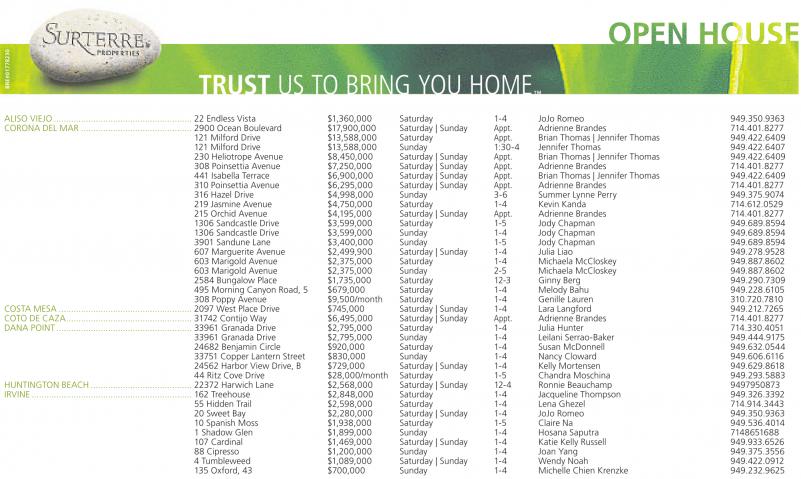 ALISO VIEJO........................................................ 22 Endless Vista $1,360,000 Saturday 1-4 JoJo Romeo 949.350.9363 CORONA DEL MAR ............................................. 2900 Ocean Boulevard $17,900,000 Saturday | Sunday Appt. Adrienne Brandes 714.401.8277 121 Milford Drive $13,588,000 Saturday Appt. Brian Thomas | Jennifer Thomas 949.422.6409 121 Milford Drive $13,588,000 Sunday 1:30-4 Jennifer Thomas 949.422.6407 230 Heliotrope Avenue $8,450,000 Saturday | Sunday Appt. Brian Thomas | Jennifer Thomas 949.422.6409 308 Poinsettia Avenue $7,250,000 Saturday | Sunday Appt. Adrienne Brandes 714.401.8277 441 Isabella Terrace $6,900,000 Saturday | Sunday Appt. Brian Thomas | Jennifer Thomas 949.422.6409 310 Poinsettia Avenue $6,295,000 Saturday | Sunday Appt. Adrienne Brandes 714.401.8277 316 Hazel Drive $4,998,000 Sunday 3-6 Summer Lynne Perry 949.375.9074 219 Jasmine Avenue $4,750,000 Saturday 1-4 Kevin Kanda 714.612.0529 215 Orchid Avenue $4,195,000 Saturday | Sunday Appt. Adrienne Brandes 714.401.8277 1306 Sandcastle Drive $3,599,000 Saturday 1-5 Jody Chapman 949.689.8594 1306 Sandcastle Drive $3,599,000 Sunday 1-4 Jody Chapman 949.689.8594 3901 Sandune Lane $3,400,000 Sunday 1-5 Jody Chapman 949.689.8594 607 Marguerite Avenue $2,499,900 Saturday | Sunday 1-4 Julia Liao 949.278.9528 603 Marigold Avenue $2,375,000 Saturday 1-4 Michaela McCloskey 949.887.8602 603 Marigold Avenue $2,375,000 Sunday 2-5 Michaela McCloskey 949.887.8602 2584 Bungalow Place $1,735,000 Saturday 12-3 Ginny Berg 949.290.7309 495 Morning Canyon Road, 5 $679,000 Saturday 1-4 Melody Bahu 949.228.6105 308 Poppy Avenue $9,500/month Saturday 1-4 Genille Lauren 310.720.7810 COSTA MESA ...................................................... 2097 West Place Drive $745,000 Saturday | Sunday 1-4 Lara Langford 949.212.7265 COTO DE CAZA................................................... 31742 Contijo Way $6,495,000 Saturday | Sunday Appt. Adrienne Brandes 714.401.8277 DANA POINT....................................................... 33961 Granada Drive $2,795,000 Saturday 1-4 Julia Hunter 714.330.4051 33961 Granada Drive $2,795,000 Sunday 1-4 Leilani Serrao-Baker 949.444.9175 24682 Benjamin Circle $920,000 Saturday 1-4 Susan McDonnell 949.632.0544 33751 Copper Lantern Street $830,000 Sunday 1-4 Nancy Cloward 949.606.6116 24562 Harbor View Drive, B $729,000 Saturday | Sunday 1-4 Kelly Mortensen 949.629.8618 44 Ritz Cove Drive $28,000/month Saturday 1-5 Chandra Moschina 949.293.5883 HUNTINGTON BEACH......................................... 22372 Harwich Lane $2,568,000 Saturday | Sunday 12-4 Ronnie Beauchamp 9497950873 IRVINE ................................................................. 162 Treehouse $2,848,000 Saturday 1-4 Jacqueline Thompson 949.326.3392 55 Hidden Trail $2,598,000 Saturday 1-4 Lena Ghezel 714.914.3443 20 Sweet Bay $2,280,000 Saturday | Sunday 1-4 JoJo Romeo 949.350.9363 10 Spanish Moss $1,938,000 Saturday 1-5 Claire Na 949.536.4014 1 Shadow Glen $1,899,000 Sunday 1-4 Hosana Saputra 7148651688 107 Cardinal $1,469,000 Saturday | Sunday 1-4 Katie Kelly Russell 949.933.6526 88 Cipresso $1,200,000 Sunday 1-4 Joan Yang 949.375.3556 4 Tumbleweed $1,089,000 Saturday | Sunday 1-4 Wendy Noah 949.422.0912 135 Oxford, 43 $700,000 Sunday 1-4 Michelle Chien Krenzke 949.232.9625