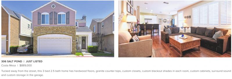 306 SALT POND | JUST LISTED Costa Mesa | $889,000 Tucked away from the street, this 3 bed 2.5 bath home has hardwood floors, granite counter tops, custom closets, custom blackout shades in each room, custom cabinets, surround sound and custom storage in the garage.