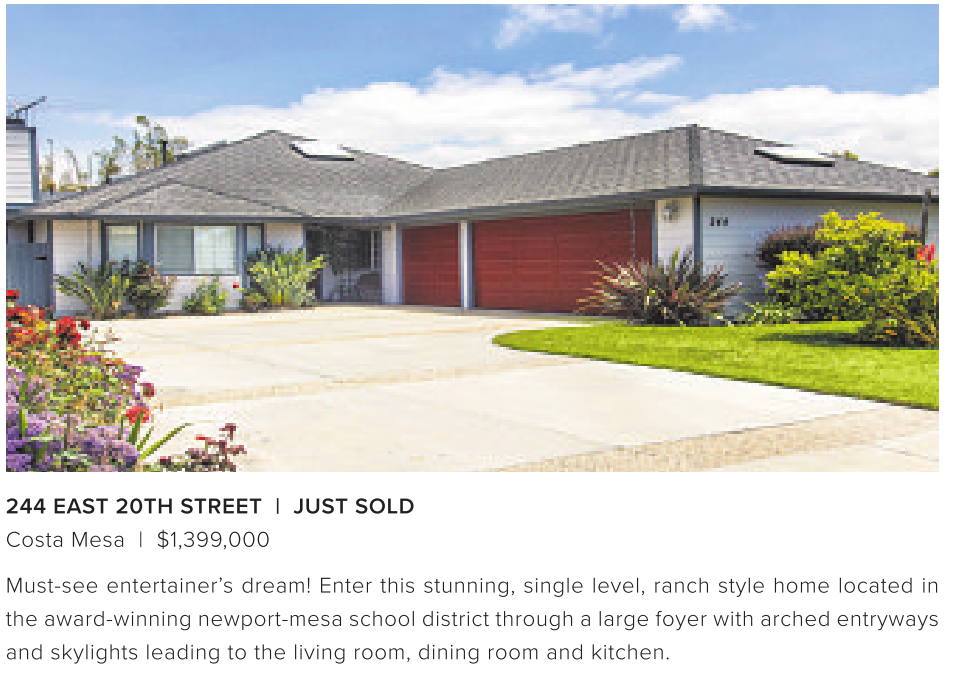 244 EAST 20TH STREET | JUST SOLD Costa Mesa | $1,399,000 Must-see entertainer’s dream! Enter this stunning, single level, ranch style home located in the award-winning newport-mesa school district through a large foyer with arched entryways and skylights leading to the living room, dining room and kitchen.