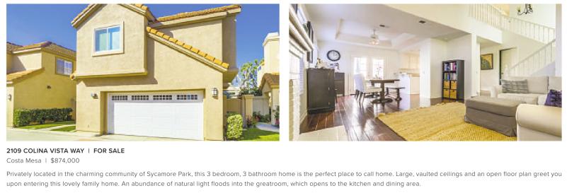2109 COLINA VISTA WAY | FOR SALE Costa Mesa | $874,000 Privately located in the charming community of Sycamore Park, this 3 bedroom, 3 bathroom home is the perfect place to call home. Large, vaulted ceilings and an open floor plan greet you upon entering this lovely family home. An abundance of natural light floods into the greatroom, which opens to the kitchen and dining area.