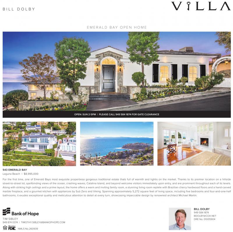 B I L L D O L B Y E M E R A L D B AY O P E N H O M E OPEN: SUN 2-5PM | PLEASE CALL 949 584 1874 FOR GATE CLEARANCE 543 EMERALD BAY Laguna Beach | $8,995,000 For the first time, one of Emerald Bays most exquisite propertiesa gorgeous traditional estate thats full of warmth and lightis on the market. Thanks to its premier location on a hillside street-to-street lot, spellbinding views of the ocean, crashing waves, Catalina Island, and beyond welcome visitors immediately upon entry, and are prominent throughout each of its levels. Along with striking high ceilings and a prime layout, the home offers a warm and inviting family room, a stunning living room replete with Brazilian cherry hardwood floors and a hand-carved marble fireplace, and a gourmet kitchen with appliances by Sub Zero and Viking. Spanning approximately 5,272 square feet of living space, including five bedrooms and four-and-one-half bathrooms, it exudes exceptional quality and meticulous attention to detail at every turn, showcasing impeccable design by renowned architect Michael Martin. TIM SIBLEY 949 874 0374 | TIMOTHY.SIBLEY@BANKOFHOPE.COM BILL DOLBY 949 584 1874 BDOLBY@COX.NET DRE No. 01005904 NMLS No.260939