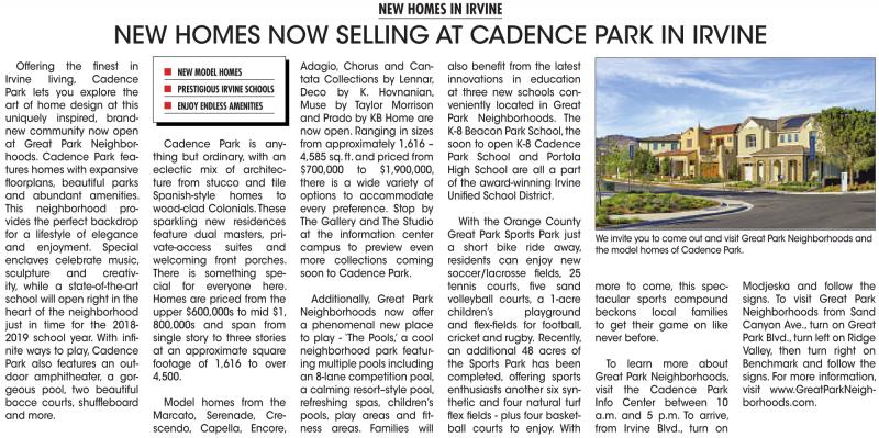 NEW HOMES NOW SELLING AT CADENCE PARK IN IRVINE