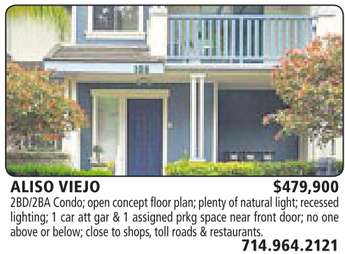 ALISO VIEJO $479,900 2BD/2BA Condo; open concept floor plan; plenty of natural light; recessed lighting; 1car att gar &1assigned prkg space near front door; no one above or below; close to shops,toll roads &restaurants.