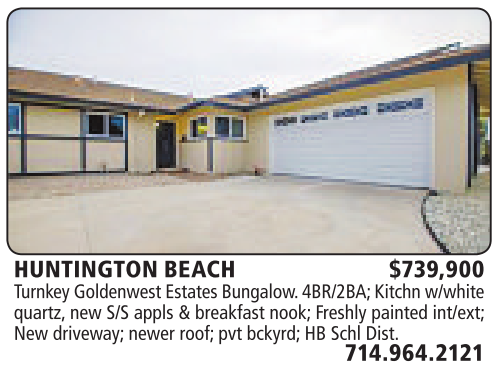 HUNTINGTON BEACH $739,900 Turnkey Goldenwest Estates Bungalow.4BR/2BA; Kitchn w/white quartz, new S/S appls &breakfast nook; Freshly painted int/ext; New driveway; newer roof; pvt bckyrd; HB Schl Dist.