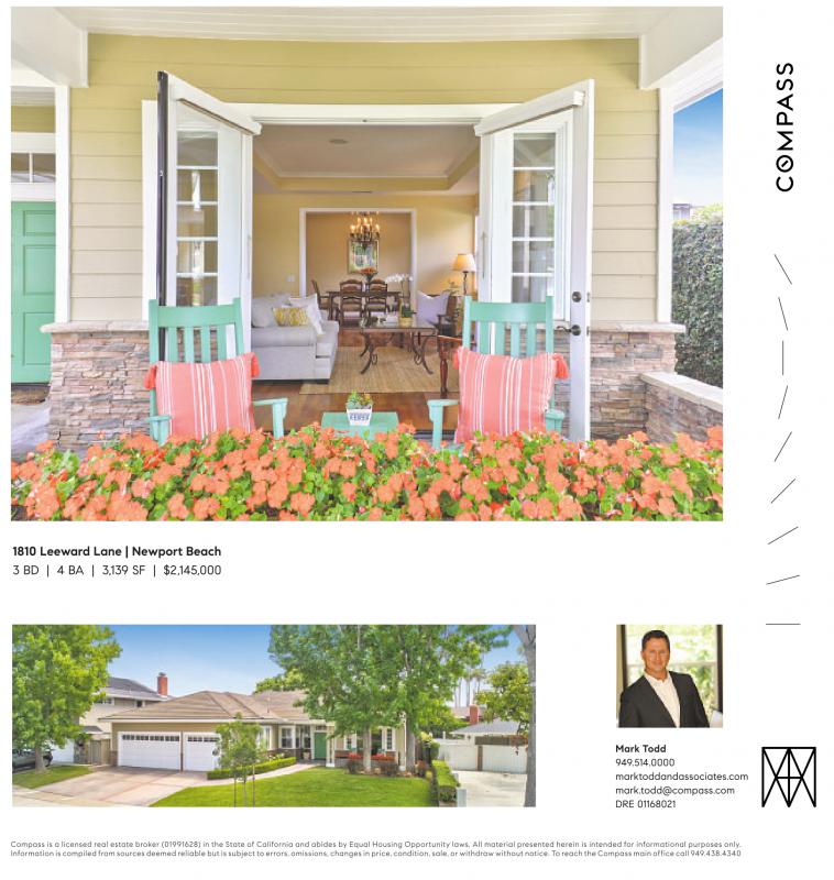 1810 Leeward Lane | Newport Beach 3 BD | 4 BA | 3,139 SF | $2,145,000 Mark Todd 949.514.0000 marktoddandassociates.com mark.todd@compass.com DRE 01168021 Compass is alicensed real estate broker (01991628) in the State of California and abides by Equal Housing Opportunity laws. All material presented herein is intended for informational purposes only. Information is compiled from sourcesdeemed reliable but is subjecttoerrors, omissions, changesinprice, condition, sale,orwithdraw without notice. To reach theCompass main officecall949.438.4340