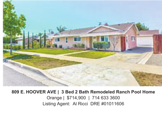 809 E. HOOVER AVE | 3Bed 2Bath Remodeled Ranch Pool Home Orange | $714,900 | 714 633 3600 Listing Agent: AlRicci DRE #01011606