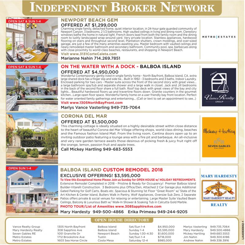 Vance Realty Group 1305 North Bayfront Balboa Island Sat/Sun 1-4 $4,950,000 Marlys Vasterling 949.735.7064 Mary Hardesty Realty 308 Sapphire Ave Balboa Island Sunday 1-4 $3,595,000 Mary Hardesty 949.500.4866 Seven Gables RE 1051 Granville Dr Newport Beach Sunday 1:30-4:30 $1,600,000 Mickey Hartling 949.683.5553 Metro Estates 1712 Brookshire Ave Tustin Sat/Sun 1-4 $718,000 Jim Nahin 949.300.6186 Metro Estates 1603 Sea Horse Circle Costa Mesa Saturday 12-4 $985,000 Andrew Nahin 949.338.3916