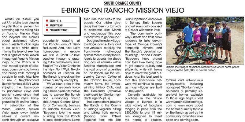 “We’ve seen a rise in the number of residents favoring e-bikes as an alternative way to explore The Ranch and surrounding areas,” said Amaya Genaro, Director of Community Services for Rancho Mission Viejo. “Residents love the ease of riding from The Ranch to local destinations. Some