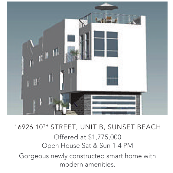 16926 10 TH STREET, UNIT B, SUNSET BEACH Offered at $1,775,000 Open House Sat & Sun 1-4 PM Gorgeous newly constructed smart home with modern amenities.
