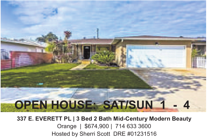 337 E. EVERETT PL |3Bed 2Bath Mid-Century Modern Beauty Orange | $674,900 | 714 633 3600 Hosted by Sherri Scott DRE #01231516