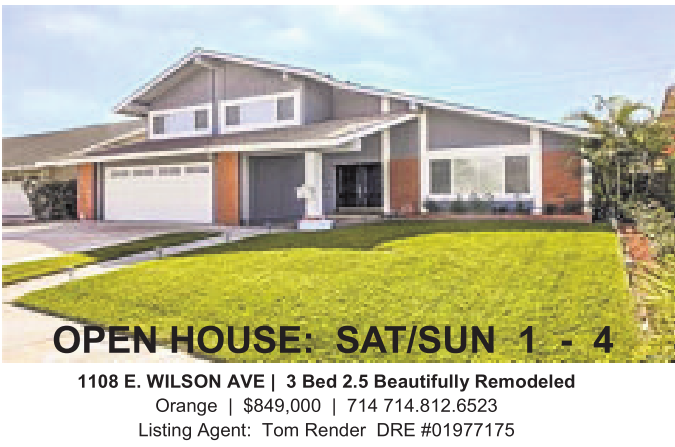 1108 E.WILSON AVE | 3 Bed 2.5 Beautifully Remodeled Orange | $849,000 | 714 714.812.6523 Listing Agent: Tom Render DRE #01977175