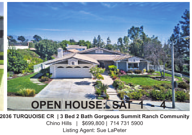 2036 TURQUOISE CR |3Bed 2Bath Gorgeous Summit Ranch Community Chino Hills | $699,800 | 714 731 5900 Listing Agent: Sue LaPeter