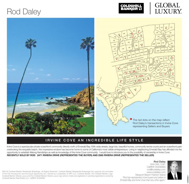 Irvine Cove is aspectacularprivate oceanfront communitydirectly north of Emerald Bay.With wide streets, large lots, beautiful homes, community tennis courts and an oceanfront park overlooking the exquisite beach, this impressive enclave has become home to some of California’s most visible entrepreneurs. Living in neighboring Emerald Bay has afforded me the opportunity to establish lifelong friendships as well as knowledge of the Irvine Cove community. I would love to introduce you to the possibility of ownership in Irvine Cove. RECENTLY SOLD BY ROD 2471 RIVIERA DRIVE (REPRESENTED THE BUYER) AND 2585 RIVIERA DRIVE (REPRESENTED THE SELLER)