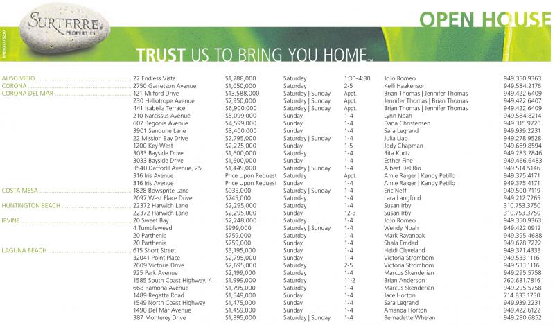 ALISO VIEJO........................................................ 22 Endless Vista $1,288,000 Saturday...................1:30-4:30 JoJo Romeo 949.350.9363 CORONA............................................................. 2750 Garretson Avenue $1,050,000 Saturday 2-5 Kelli Haakenson 949.584.2176 CORONA DEL MAR ............................................. 121 Milford Drive $13,588,000 Saturday | Sunday Appt. Brian Thomas | Jennifer Thomas 949.422.6409 230 Heliotrope Avenue $7,950,000 Saturday | Sunday Appt. Jennifer Thomas | Brian Thomas 949.422.6407 441 Isabella Terrace $6,900,000 Saturday | Sunday Appt. Brian Thomas | Jennifer Thomas 949.422.6409 210 Narcissus Avenue $5,099,000 Sunday 1-4 Lynn Noah 949.584.8214 607 Begonia Avenue $4,599,000 Sunday 1-4 Dana Christensen 949.315.9720 3901 Sandune Lane $3,400,000 Sunday 1-4 Sara Legrand 949.939.2231 22 Mission Bay Drive $2,795,000 Saturday | Sunday 1-4 Julia Liao 949.278.9528 1200 Key West $2,225,000 Sunday 1-5 Jody Chapman 949.689.8594 3033 Bayside Drive $1,600,000 Saturday 1-4 Rita Kurtz 949.283.2846 3033 Bayside Drive $1,600,000 Sunday 1-4 Esther Fine 949.466.6483 3540 Daffodil Avenue, 25 $1,449,000 Saturday | Sunday 1-4 Albert Del Rio 949.514.5146 316 Iris Avenue Price Upon Request Saturday Appt. Amie Raiger | Kandy Petillo 949.375.4171 316 Iris Avenue Price Upon Request Sunday 1-4 Amie Raiger | Kandy Petillo 949.375.4171 COSTA MESA ...................................................... 1828 Bowsprite Lane $935,000 Saturday | Sunday 1-4 Eric Neff 949.500.7119 2097 West Place Drive $745,000 Saturday 1-4 Lara Langford 949.212.7265 HUNTINGTON BEACH......................................... 22372 Harwich Lane $2,295,000 Saturday 1-4 Susan Irby 310.753.3750 22372 Harwich Lane $2,295,000 Sunday 12-3 Susan Irby 310.753.3750 IRVINE ................................................................. 20 Sweet Bay $2,248,000 Saturday 1-4 JoJo Romeo 949.350.9363 4 Tumbleweed $999,000 Saturday | Sunday 1-4 Wendy Noah 949.422.0912 20 Parthenia $759,000 Saturday 1-4 Mark Ravanpak 949.395.4688 20 Parthenia $759,000 Sunday 1-4 Shala Emdadi 949.678.7222 LAGUNA BEACH................................................. 615 Short Street $3,195,000 Sunday 1-4 Heidi Cleveland 949.371.4333 32041 Point Place $2,795,000 Sunday 1-4 Victoria Strombom 949.533.1116 2609 Victoria Drive $2,695,000 Saturday 2-5 Victoria Strombom 949.533.1116 925 Park Avenue $2,199,000 Saturday 1-4 Marcus Skenderian 949.295.5758 1585 South Coast Highway, 4 $1,999,000 Saturday 11-2 Brian Anderson 760.681.7816 668 Ramona Avenue $1,795,000 Saturday 1-4 Marcus Skenderian 949.295.5758 1489 Regatta Road $1,549,000 Sunday 1-4 Jace Horton 714.833.1730 1549 North Coast Highway $1,475,000 Sunday 1-4 Sara Legrand 949.939.2231 1490 Del Mar Avenue $1,459,000 Sunday 1-4 Amanda Horton 949.422.6122 387 Monterey Drive $1,395,000 Saturday | Sunday 1-4 Bernadette Whelan 949.280.6852