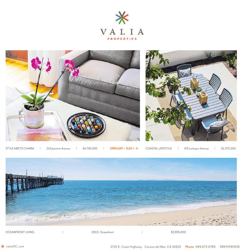 STYLE MEETSCHARM | 224 Jasmine Avenue | $4,795,000 | OPEN SAT+ SUN 1-4 COASTALLIFESTYLE | 613 Larkspur Avenue | $2,375,000 OCEANFRONT LIVING | 200 E. Oceanfront | $3,995,000 valiaOC.com 2720 E. Coast Highway, Corona del Mar, CA 92625 Phone 949.673.0789 DRE#01911636