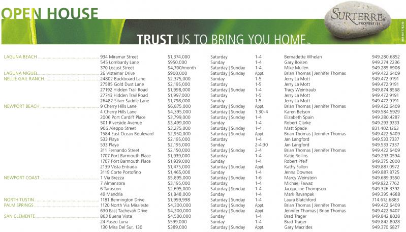 LAGUNA BEACH................................................. 934 Miramar Street $1,374,000 Saturday 1-4 Bernadette Whelan 949.280.6852 545 Lombardy Lane $950,000 Sunday 1-4 Gary Boisen 949.274.2236 370 Locust Street $4,700/month Saturday | Sunday 1-4 Mike Mullen 949.285.6906 LAGUNA NIGUEL................................................. 26 Vistamar Drive $900,000 Saturday | Sunday Appt. Brian Thomas | Jennifer Thomas 949.422.6409 NELLIE GAIL RANCH............................................ 24802 Buckboard Lane $2,375,000 Sunday 1-5 Jerry La Mott 949.472.9191 27585 Gold Dust Lane $2,195,000 Saturday 1-5 Jerry La Mott 949.472.9191 27192 Hidden Trail Road $1,998,000 Saturday | Sunday 1-4 Tracy Weintraub 949.874.8568 27743 Hidden Trail Road $1,997,000 Saturday 1-5 Jerry La Mott 949.472.9191 26482 Silver Saddle Lane $1,798,000 Sunday 1-5 Jerry La Mott 949.472.9191 NEWPORT BEACH............................................... 9 Cherry Hills Lane $6,875,000 Saturday | Sunday Appt. Brian Thomas | Jennifer Thomas 949.422.6409 4 Cherry Hills Lane $4,395,000 Saturday | Sunday 1:30-4 Karen Betson 949.584.5929 2006 Port Cardiff Place $3,799,000 Saturday | Sunday 1-4 Elizabeth Spain 949.280.4287 501 Riverside Avenue $3,499,000 Sunday 1-4 Robert Clarke 949.293.9333 906 Aleppo Street $3,275,000 Saturday | Sunday 1-4 Matt Spade 831.402.1263 1584 East Ocean Boulevard $2,950,000 Saturday | Sunday Appt. Brian Thomas | Jennifer Thomas 949.422.6409 533 Playa $2,195,000 Saturday 1-4 Jan Langford 949.533.7337 533 Playa $2,195,000 Sunday 2-4:30 Jan Langford 949.533.7337 311 Fernando Street $2,150,000 Saturday | Sunday 2-4 Brian Thomas | Jennifer Thomas 949.422.6409 1707 Port Barmouth Place $1,939,000 Saturday 1-4 Katie Rollins 949.293.0594 1707 Port Barmouth Place $1,939,000 Sunday 1-4 Robert Pfeif 949.375.2000 2139 Vista Entrada $1,475,000 Saturday | Sunday Appt. Kathy Fallon 949.887.0972 3119 Corte Portofino $1,465,000 Sunday 1-4 Jenna Downes 949.887.8725 NEWPORT COAST............................................... 1 Via Brezza $5,895,000 Saturday | Sunday 1-6 Marcy Weinstein 949.689.3550 7 Almanzora $3,195,000 Saturday 1-4 Michael Fawaz 949.922.7762 6 Tarascon $2,695,000 Saturday | Sunday 1-4 Jacqueline Thompson 949.326.3392 49 Mandria $1,848,000 Sunday 1-4 Mark Ravanpak 949.395.4688 NORTH TUSTIN.................................................... 1181 Bennington Drive $1,999,998 Saturday | Sunday 1-4 Laura Blatchford 714.612.6883 PALM SPRINGS.................................................... 1120 North Via Miraleste $4,300,000 Saturday | Sunday Appt. Brian Thomas | Jennifer Thomas 949.422.6409 630 East Tachevah Drive $4,300,000 Saturday | Sunday Appt. Jennifer Thomas | Brian Thomas 949.422.6407 SAN CLEMENTE................................................... 803 Buena Vista $4,500,000 Sunday 1-4 Brad Trager 949.842.8028 24 Paseo Luna $599,000 Sunday 1-4 Brad Trager 949.842.8028 130 Mira Del Sur, 130 $389,000 Saturday | Sunday Appt. Gary Macrides 949.370.6827