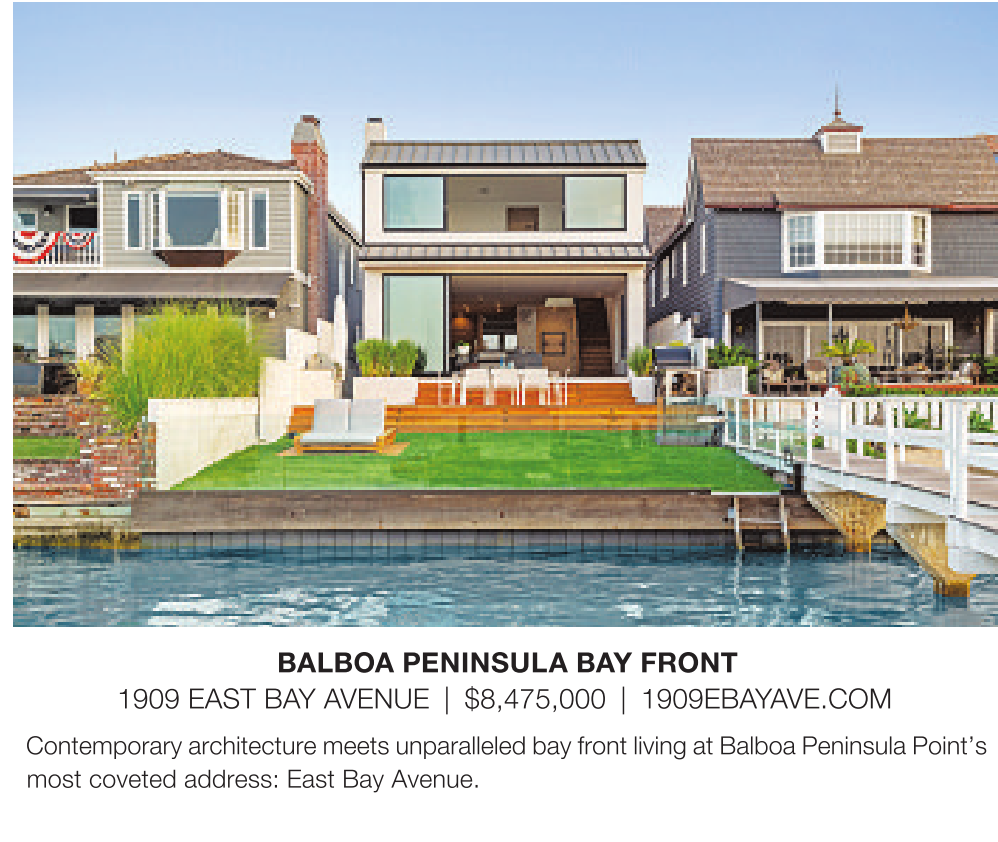 BALBOA PENINSULA BAY FRONT 1909 EAST BAY AVENUE | $8,475,000 | 1909EBAYAVE.COM Contemporary architecture meets unparalleled bay front living at Balboa Peninsula Point’s most coveted address: East Bay Avenue.