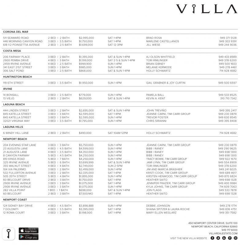 204 EVENING STAR LANE 3 BED | 3 BATH $5,750,000 SUN 1-4PM JEANNE CARNI, TIM CARR GROUP 949 230 0879 23 AUGUSTA LANE 4 BED | 4.5 BATH $4,599,000 SUN 1-4PM BIBB | RANEY 949 290 9625 21 AUGUSTA LANE 4 BED | 3.5 BATH $4,350,000 SUN 1-4PM BIBB | RANEY 949 698 1300 8 CANYON FAIRWAY 5 BED | 4.5 BATH $4,250,000 SUN 1-4PM BIBB | RANEY 949 698 1300 810 KINGS ROAD 5 BED | 7 BATH $4,250,000 SUN 1-4PM TRACY BOWIE, TIM CARR GROUP 949 922 1670 325 IRVINE AVENUE 5 BED | 6 BATH $3,699,999 SAT & SUN 1-4PM JAMI LYNN, TIM CARR GROUP 949 554 8909 355 WALNUT STREET 4 BED | 4 BATH $2,749,000 SUN 2-5PM TORI RIMLINGER 949 378 6200 104 VIA PALERMO 3 BED | 2 BATH $2,499,000 SUN 1-4PM JIM AND MARCIA BRASHIER 949 241 6025 532 FULLERTON AVENUE 3 BED | 2 BATH $2,335,000 SAT 1-4PM KRISTI COOK, TIM CARR GROUP 949 689 4617 505 35TH STREET 5 BED | 4 BATH $1,895,000 SUN 1-4PM KIRSTEN HENWOOD, TIM CARR GROUP 949 870 6824 60 BELCOURT DRIVE 2 BED | 3 BATH $1,750,000 SAT 1-4PM HEATHER SAITO 949 698 1328 2908 IRVINE AVENUE 3 BED | 3 BATH $1,075,000 SAT 1-4PM JENNIFER FRAZIER, TIM CARR GROUP 949 400 9984 2908 IRVINE AVENUE 3 BED | 3 BATH $1,075,000 SUN 1-4PM KYLA JOHNS, TIM CARR GROUP 714 609 7063 282 VILLA POINT 1 BED | 1 BATH $698,000 SAT & SUN 1-4PM JON FLAGG 949 533 7878 60 BELCOURT 2 BED | 3 BATH $7,500/MO SAT 1-4PM HEATHER SAITO 949 698 1328
