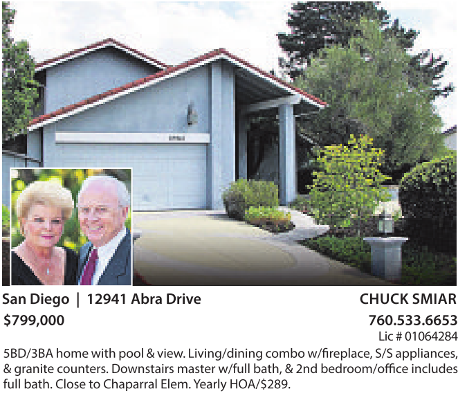 5BD/3BA home with pool &view. Living/dining combo w/fireplace, S/S appliances, &granitecounters.Downstairs master w/full bath, &2nd bedroom/office includes full bath. Close to Chaparral Elem. Yearly HOA/$289. SanDiego | 12941 AbraDrive CHUCK SMIAR $799,000 760.533.6653 Lic #01064284