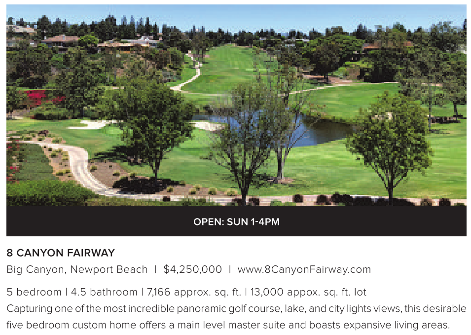OPEN: SUN 1-4PM 8 CANYON FAIRWAY Big Canyon, Newport Beach | $4,250,000 | www.8CanyonFairway.com 5 bedroom | 4.5 bathroom | 7,166 approx. sq. ft. | 13,000 appox. sq. ft. lot Capturing one of the most incredible panoramic golf course,lake,and city lights views, this desirable five bedroom custom home offers a main level master suite and boasts expansive living areas. See also