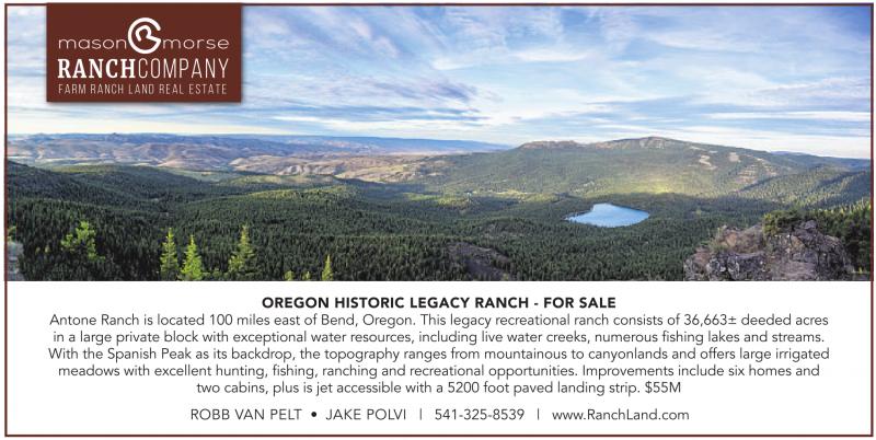 FARM RANCH LAND REAL ESTATE OREGON HISTORIC LEGACY RANCH - FOR SALE Antone Ranch is located 100 miles east of Bend, Oregon. This legacy recreational ranch consists of 36,663± deeded acres in a large private block with exceptional water resources, including live water creeks, numerous fishing lakes and streams. With the Spanish Peak as its backdrop, the topography ranges from mountainous to canyonlands and offers large irrigated meadows with excellent hunting, fishing, ranching and recreational opportunities. Improvements include six homes and two cabins, plus is jet accessible with a 5200 foot paved landing strip. $55M ROBB VAN PELT • JAKE POLVI | 541-325-8539 | www.RanchLand.com