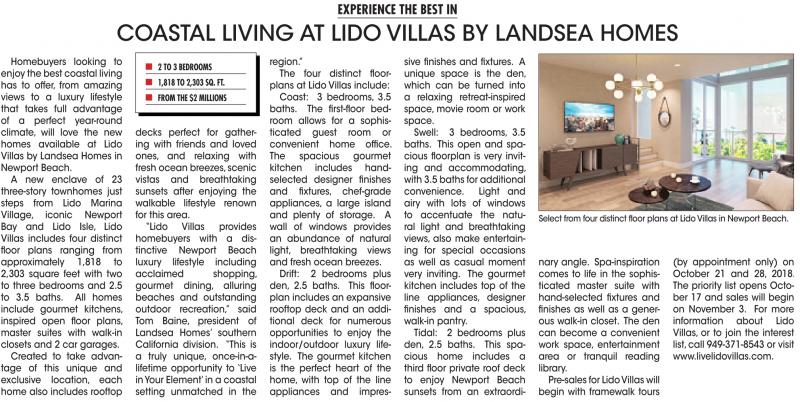 (by appointment only) on October 21 and 28, 2018. The priority list opens October 17 and sales will begin on November 3. For more information about Lido Villas, or to join the interest list, call 949-371-8543 or visit www.livelidovillas.com.