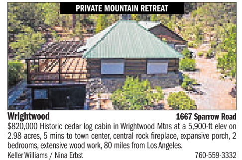 Wrightwood 1667 Sparrow Road $820,000 Historic cedarlog cabin in WrightwoodMtns at a5,900-ft elevon 2.98 acres, 5mins to town center,central rock fireplace, expansive porch, 2 bedrooms, extensive wood work, 80 miles from Los Angeles. KellerWilliams /Nina Erbst 760-559-3332