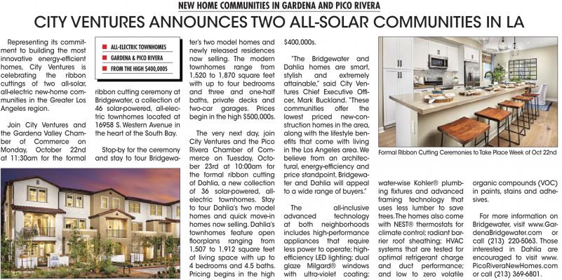 Representing its commitment to building the most innovative energy-efficient homes, City Ventures is celebrating the ribbon cuttings of two all-solar, all-electric new-home communities in the Greater Los Angeles region.