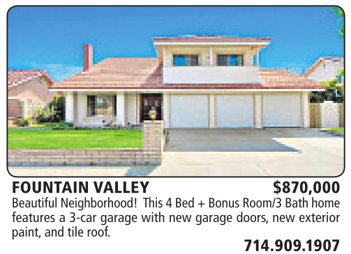 FOUNTAIN VALLEY $870,000 BeautifulNeighborhood! This 4Bed +BonusRoom/3Bathhome features a3-car garage with new garage doors,new exterior paint, and tile roof.