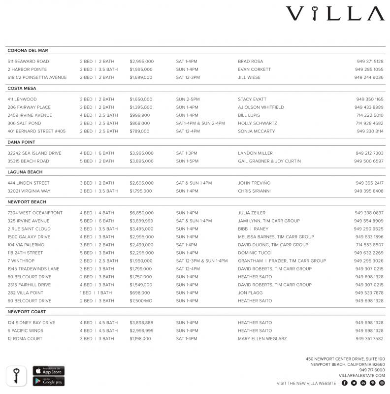 7304 WEST OCEANFRONT 4 BED | 4 BATH $6,850,000 SUN 1-4PM JULIA ZEILER 949 338 0837 325 IRVINE AVENUE 5 BED | 6 BATH $3,699,999 SAT & SUN 1-4PM JAMI LYNN, TIM CARR GROUP 949 554 8909 2 RUE SAINT CLOUD 3 BED | 3.5 BATH $3,495,000 SUN 1-4PM BIBB | RANEY 949 290 9625 1500 GALAXY DRIVE 4 BED | 3 BATH $2,995,000 SUN 1-4PM MELISSA BARNES, TIM CARR GROUP 949 633 1896 104 VIA PALERMO 3 BED | 2 BATH $2,499,000 SAT 1-4PM DAVID DUONG, TIM CARR GROUP 714 553 8807 118 24TH STREET 5 BED | 3 BATH $2,295,000 SUN 1-4PM DOMINIC TUCCI 949 632 2269 7 WINTHROP 3 BED | 2.5 BATH $1,950,000 SAT 12-3PM & SUN 1-4PM GRANTHAM | FRAZIER, TIM CARR GROUP 949 295 3026 1945 TRADEWINDS LANE 3 BED | 3 BATH $1,799,000 SAT 12-4PM DAVID ROBERTS, TIM CARR GROUP 949 307 0215 60 BELCOURT DRIVE 2 BED | 3 BATH $1,750,000 SUN 1-4PM HEATHER SAITO 949 698 1328 2315 FAIRHILL DRIVE 4 BED | 3 BATH $1,549,000 SUN 1-4PM DAVID ROBERTS, TIM CARR GROUP 949 307 0215 282 VILLA POINT 1 BED | 1 BATH $698,000 SUN 1-4PM JON FLAGG 949 533 7878 60 BELCOURT DRIVE 2 BED | 3 BATH $7,500/MO SUN 1-4PM HEATHER SAITO 949 698 1328