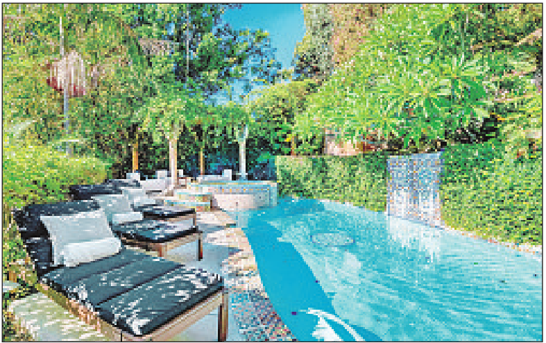 The house sits on about a quarter of an acre with a tiled swimming pool, fountains and patios.