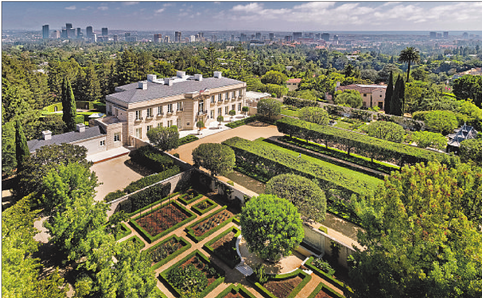 On the grounds, which encompass more than 10 acres, walls and hedges divide formal gardens, fields and specimen trees. A nearby guesthouse was designed by Wallace Neff, and the 75-foot swimming pool is accompanied by apool house.