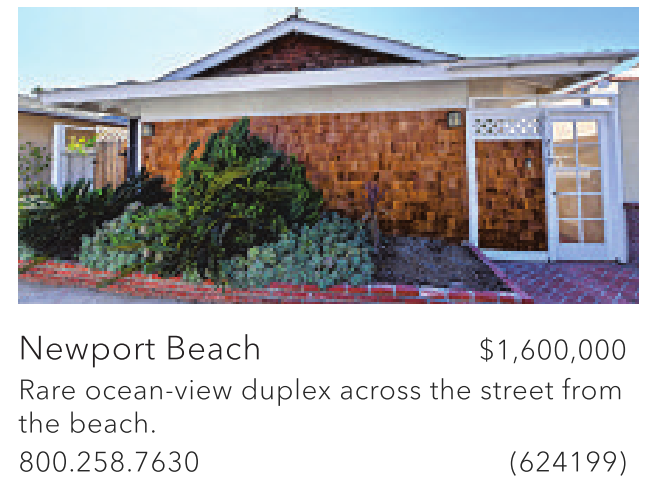 Newport Beach $1,600,000 Rare ocean-view duplex across the street from the beach.