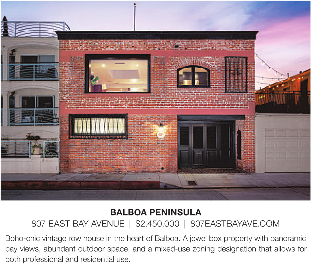 BALBOA PENINSULA 807 EAST BAY AVENUE | $2,450,000 | 807EASTBAYAVE.COM Boho-chic vintage row house in the heart of Balboa. A jewel box property with panoramic bay views, abundant outdoor space, and a mixed-use zoning designation that allows for both professional and residential use.