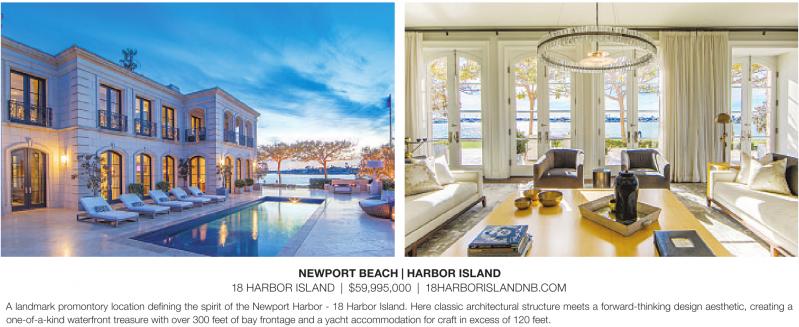 NEWPORT BEACH | HARBOR ISLAND 18 HARBOR ISLAND | $59,995,000 | 18HARBORISLANDNB.COM A landmark promontory location defining the spirit of the Newport Harbor - 18 Harbor Island. Here classic architectural structure meets a forward-thinking design aesthetic, creating a one-of-a-kind waterfront treasure with over 300 feet of bay frontage and a yacht accommodation for craft in excess of 120 feet.