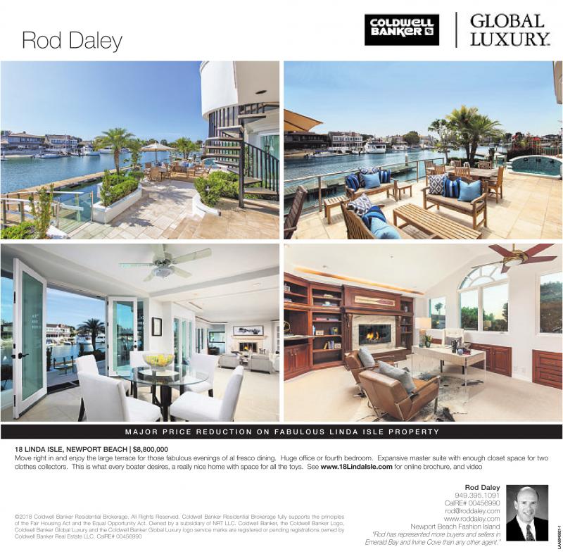 Rod Daley M A J O R P R I C E R E D U C T I O N O N FA B U L O U S L I N D A I S L E P R O P E R T Y 18 LINDA ISLE, NEWPORT BEACH | $8,800,000 Move right in and enjoy the large terrace for those fabulous evenings of al fresco dining. Huge office or fourth bedroom. Expansive master suite with enough closet space for two clothes collectors. This is what every boater desires, a really nice home with space for all the toys. See www.18LindaIsle.com for online brochure, and video ©2018 Coldwell Banker Residential Brokerage. All Rights Reserved. Coldwell Banker Residential Brokerage fully supports the principles of the Fair Housing Act and the Equal Opportunity Act. Owned by a subsidiary of NRT LLC. Coldwell Banker, the Coldwell Banker Logo, Coldwell Banker Global Luxury and the Coldwell Banker Global Luxury logo service marks are registered or pending registrations owned by Coldwell Banker Real Estate LLC. CalRE# 00456990 Rod Daley 949.395.1091 CalRE# 00456990 rod@roddaley.com www.roddaley.com Newport Beach Fashion Island “Rod has represented more buyers and sellers in Emerald Bay and Irvine Cove than any other agent.”