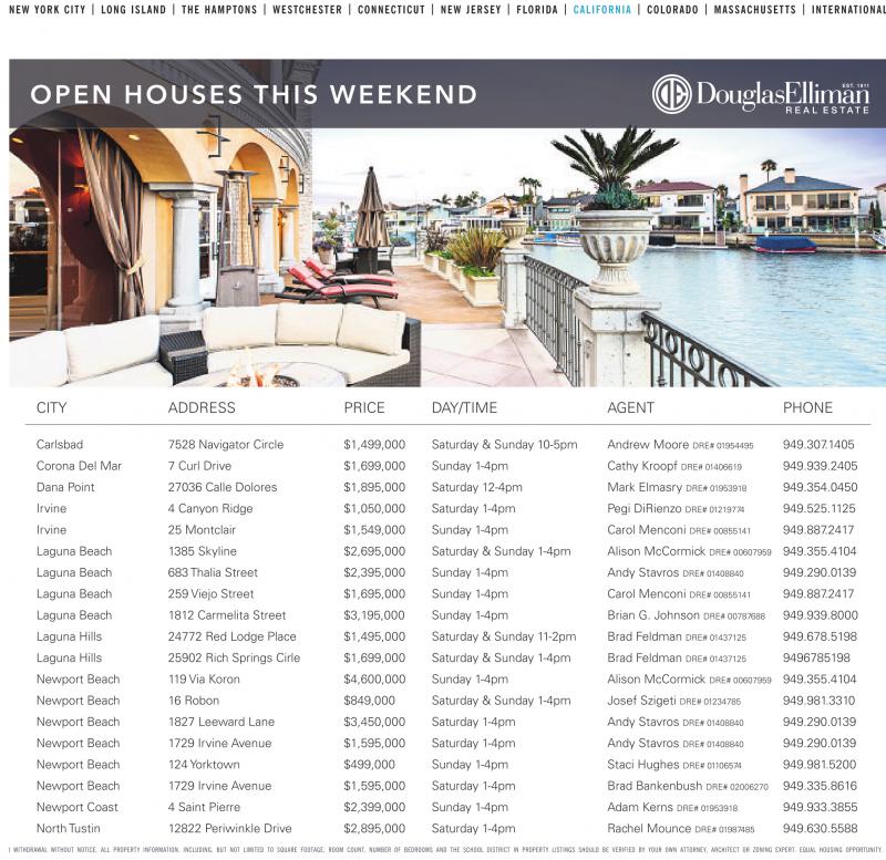 Carlsbad 7528 Navigator Circle $1,499,000 Saturday & Sunday 10-5pm Andrew Moore DRE# 01954495 949.307.1405 Corona Del Mar 7 Curl Drive $1,699,000 Sunday 1-4pm Cathy Kroopf DRE# 01406619 949.939.2405 Dana Point 27036 Calle Dolores $1,895,000 Saturday 12-4pm Mark Elmasry DRE# 01953918 949.354.0450 Irvine 4 Canyon Ridge $1,050,000 Saturday 1-4pm Pegi DiRienzo DRE# 01219774 949.525.1125 Irvine 25 Montclair $1,549,000 Sunday 1-4pm Carol Menconi DRE# 00855141 949.887.2417 Laguna Beach 1385 Skyline $2,695,000 Saturday & Sunday 1-4pm Alison McCormick DRE# 00607959 949.355.4104 Laguna Beach 683 Thalia Street $2,395,000 Sunday 1-4pm Andy Stavros DRE# 01408840 949.290.0139 Laguna Beach 259 Viejo Street $1,695,000 Sunday 1-4pm Carol Menconi DRE# 00855141 949.887.2417 Laguna Beach 1812 Carmelita Street $3,195,000 Sunday 1-4pm Brian G. Johnson DRE# 00787688 949.939.8000 Laguna Hills 24772 Red Lodge Place $1,495,000 Saturday & Sunday 11-2pm Brad Feldman DRE# 01437125 949.678.5198 Laguna Hills 25902 Rich Springs Cirle $1,699,000 Saturday & Sunday 1-4pm Brad Feldman DRE# 01437125 9496785198 Newport Beach 119 Via Koron $4,600,000 Sunday 1-4pm Alison McCormick DRE# 00607959 949.355.4104 Newport Beach 16 Robon $849,000 Saturday & Sunday 1-4pm Josef Szigeti DRE# 01234785 949.981.3310 Newport Beach 1827 Leeward Lane $3,450,000 Saturday 1-4pm Andy Stavros DRE# 01408840 949.290.0139 Newport Beach 1729 Irvine Avenue $1,595,000 Saturday 1-4pm Andy Stavros DRE# 01408840 949.290.0139 Newport Beach 124 Yorktown $499,000 Sunday 1-4pm Staci Hughes DRE# 01106574 949.981.5200 Newport Beach 1729 Irvine Avenue $1,595,000 Saturday 1-4pm Brad Bankenbush DRE# 02006270 949.335.8616 Newport Coast 4 Saint Pierre $2,399,000 Sunday 1-4pm Adam Kerns DRE# 01953918 949.933.3855 North Tustin 12822 Periwinkle Drive $2,895,000 Saturday 1-4pm Rachel Mounce DRE# 01987485 949.630.5588